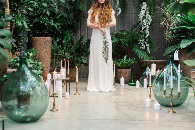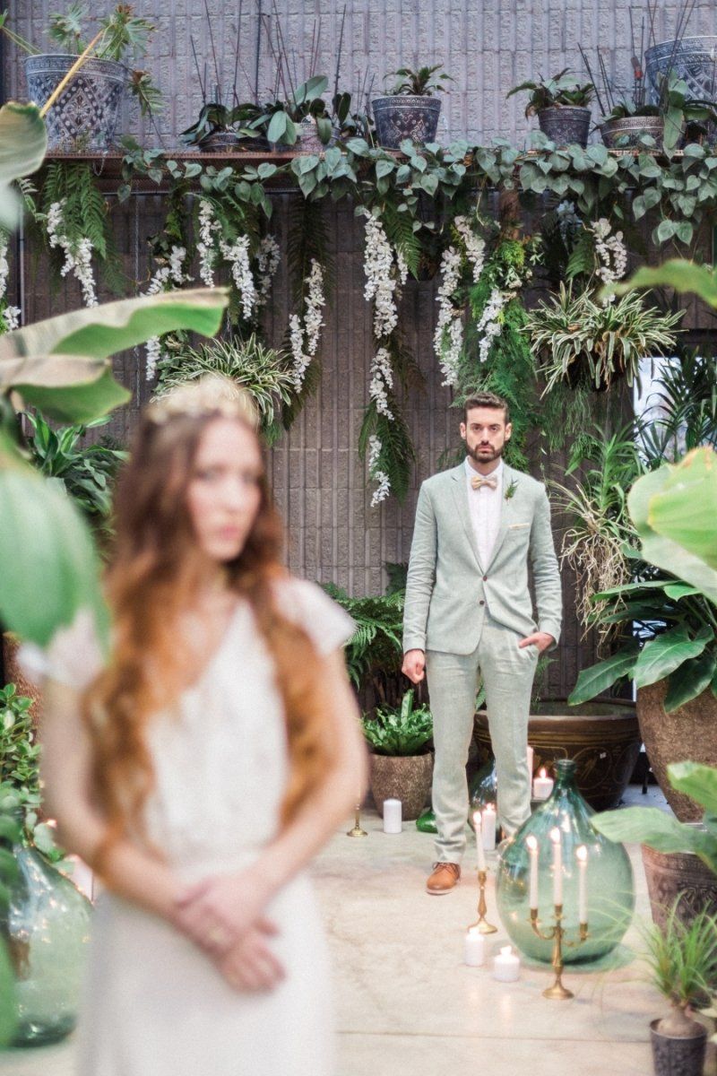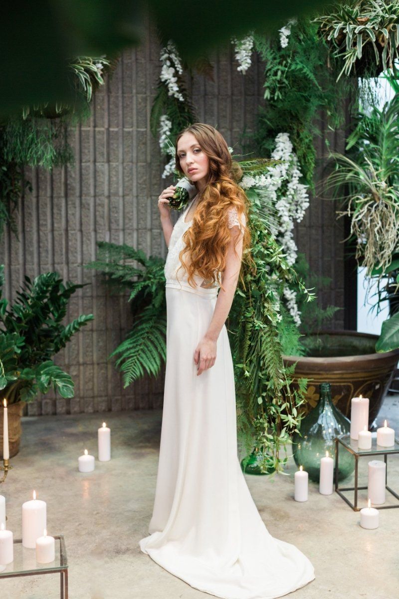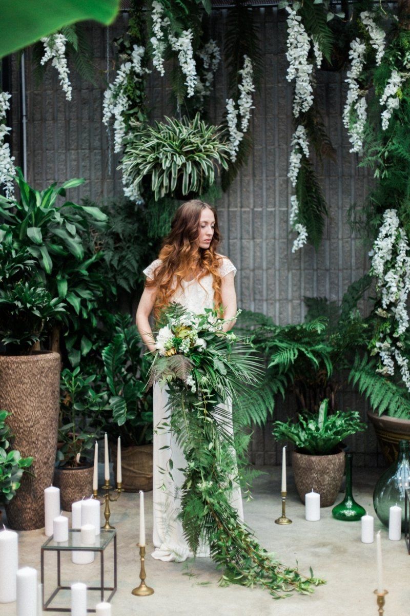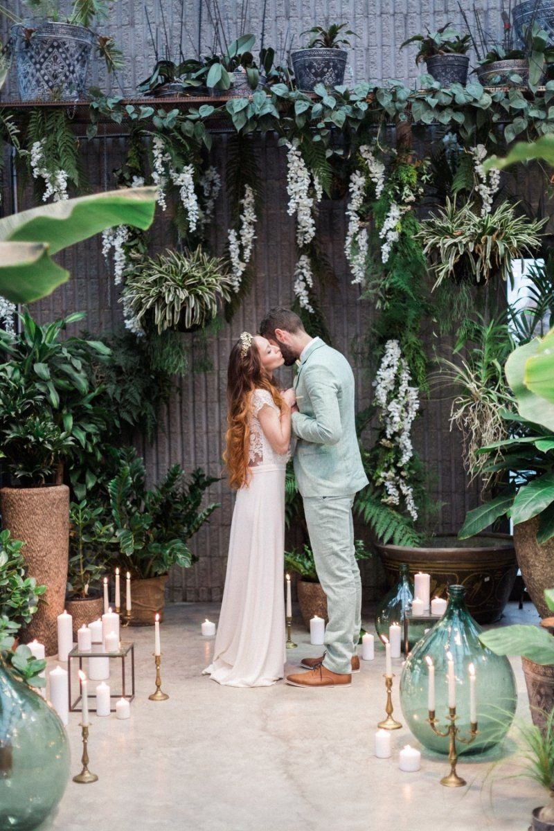 The inspiration, that was set in the stunning greenhouse with industrial touch MLA Selection, was made a greenery wedding ceremony full of plants, candles and a white flowers cascade backdrop by the talented flower designer.